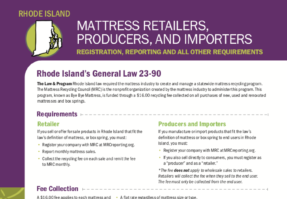 We author and share valuable resources to promote mattress recycling best practices. Whether you are a collector, manufacturer, recycler, retailer or commercial volume mattress disposer, there are a wide variety of materials available to help guide your participation in MRC and its Bye Bye Mattress program. Not sure what you’re looking for? Search by key words or title. We’re here to help!