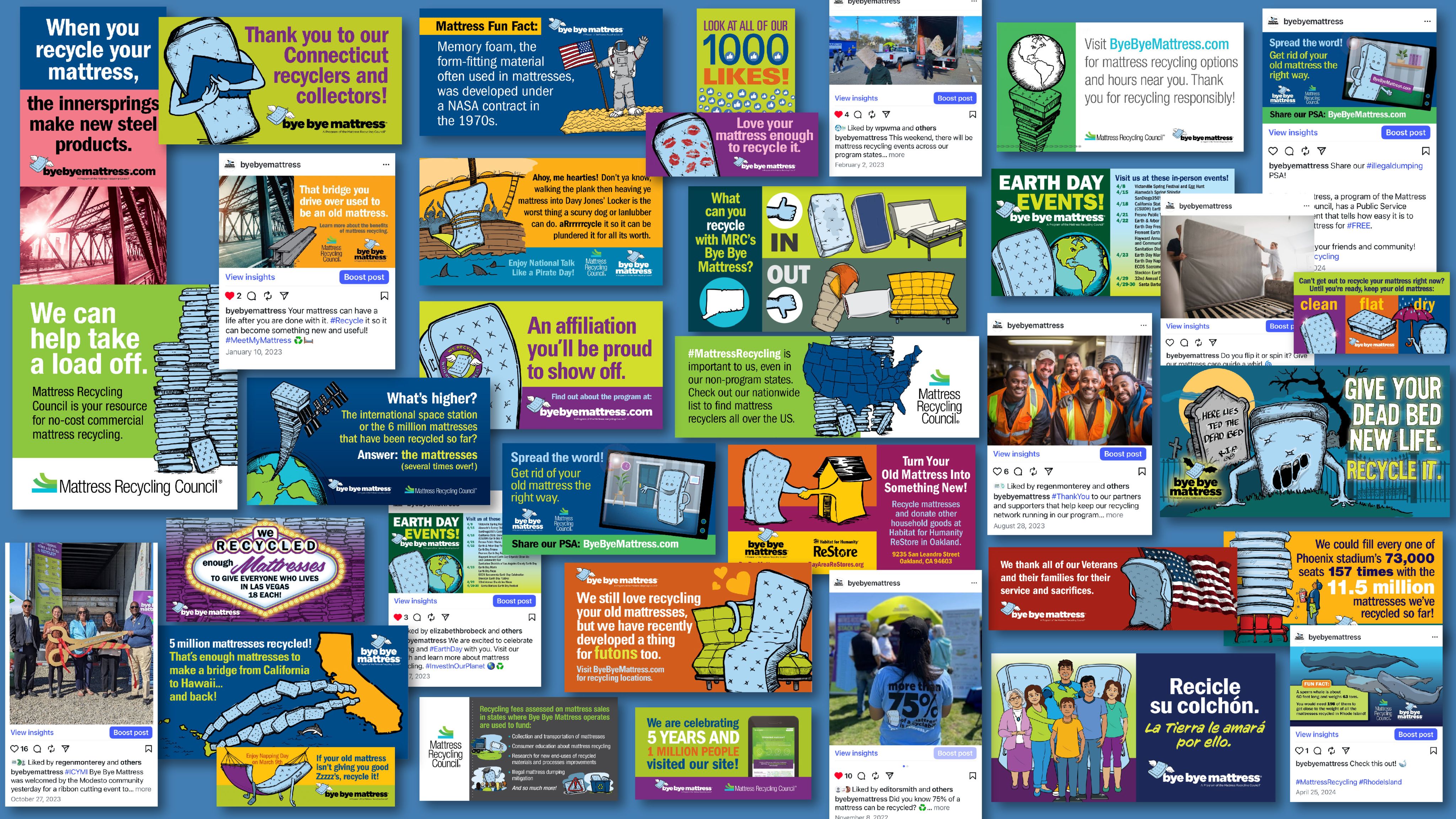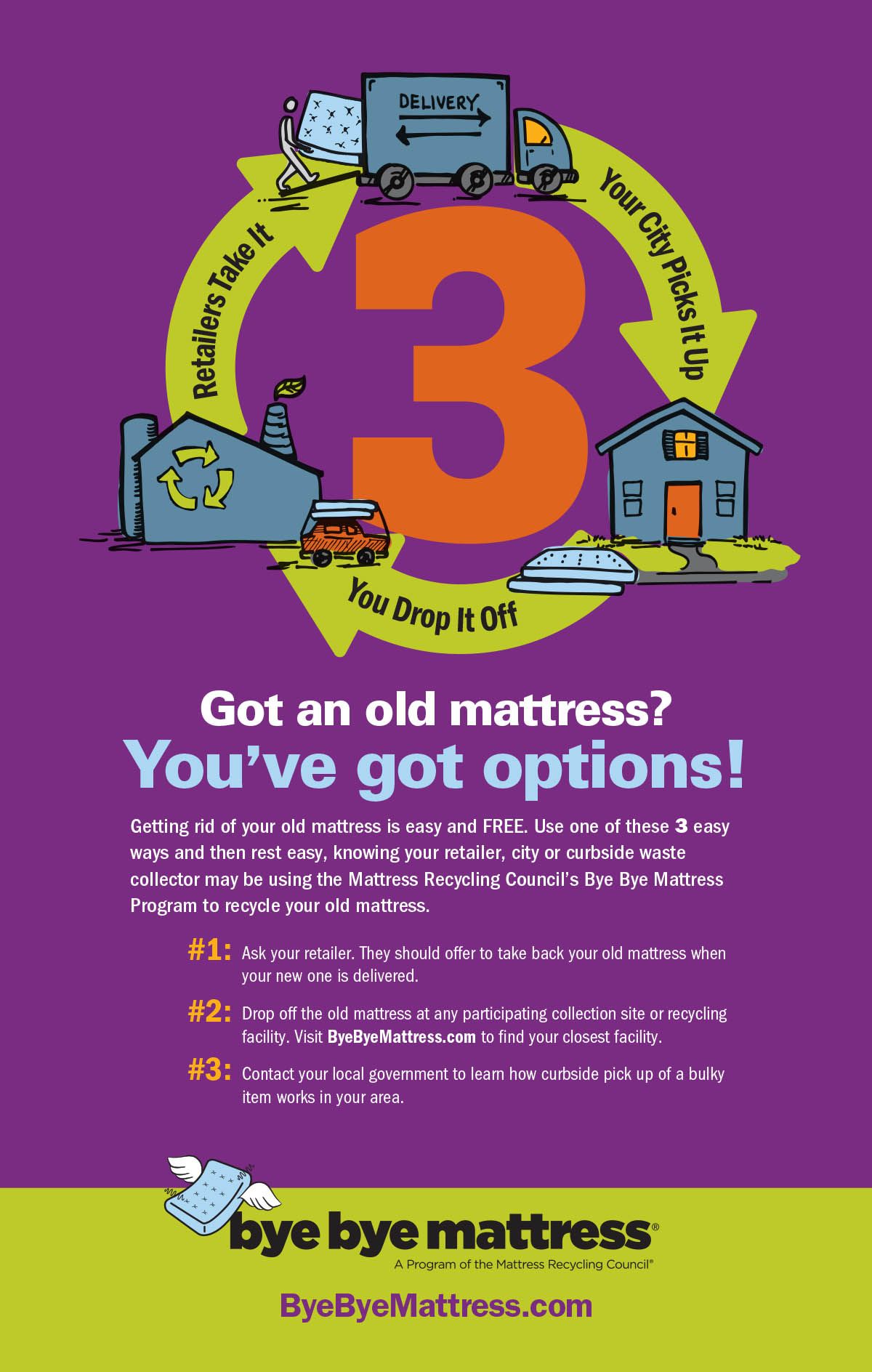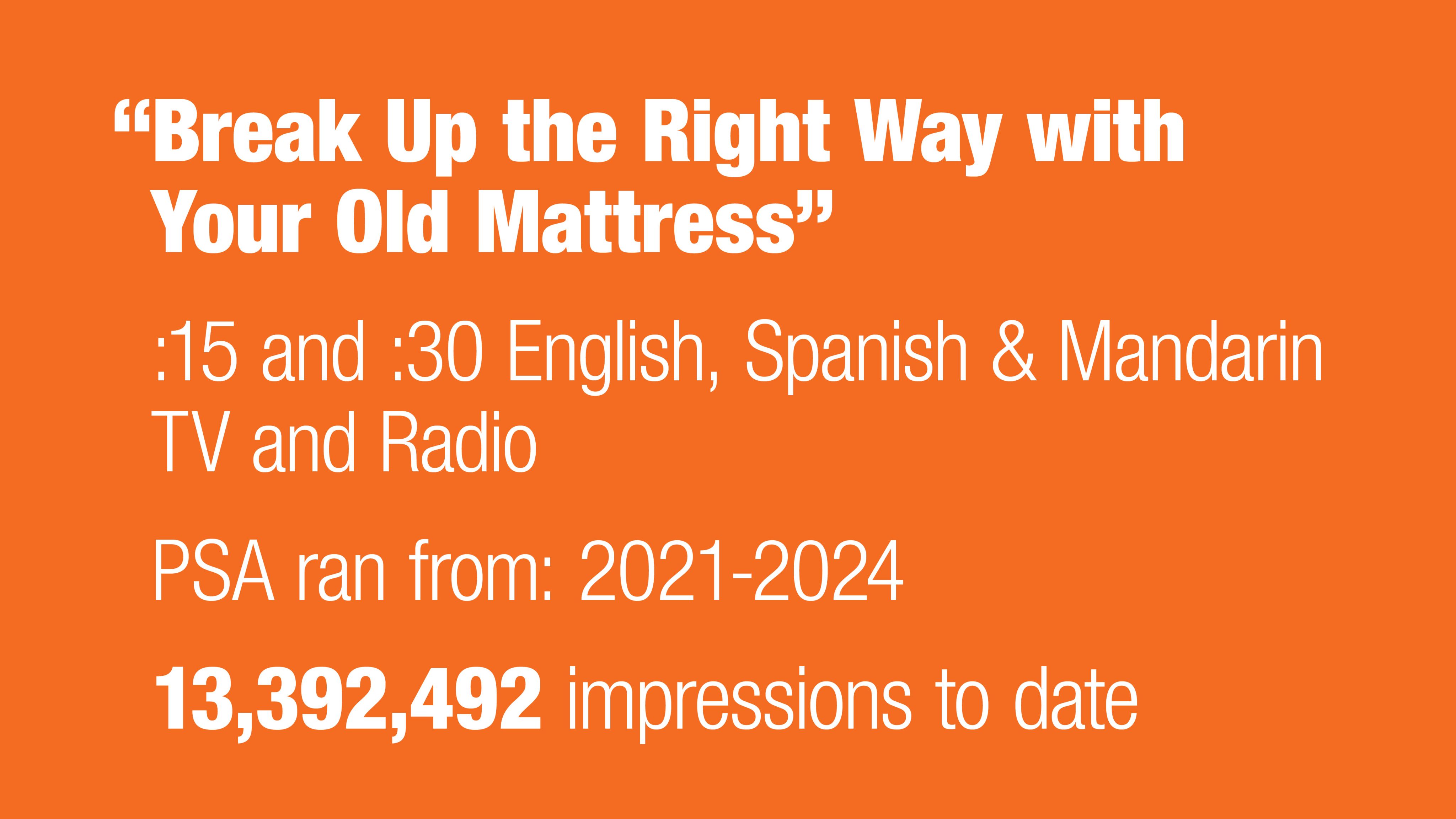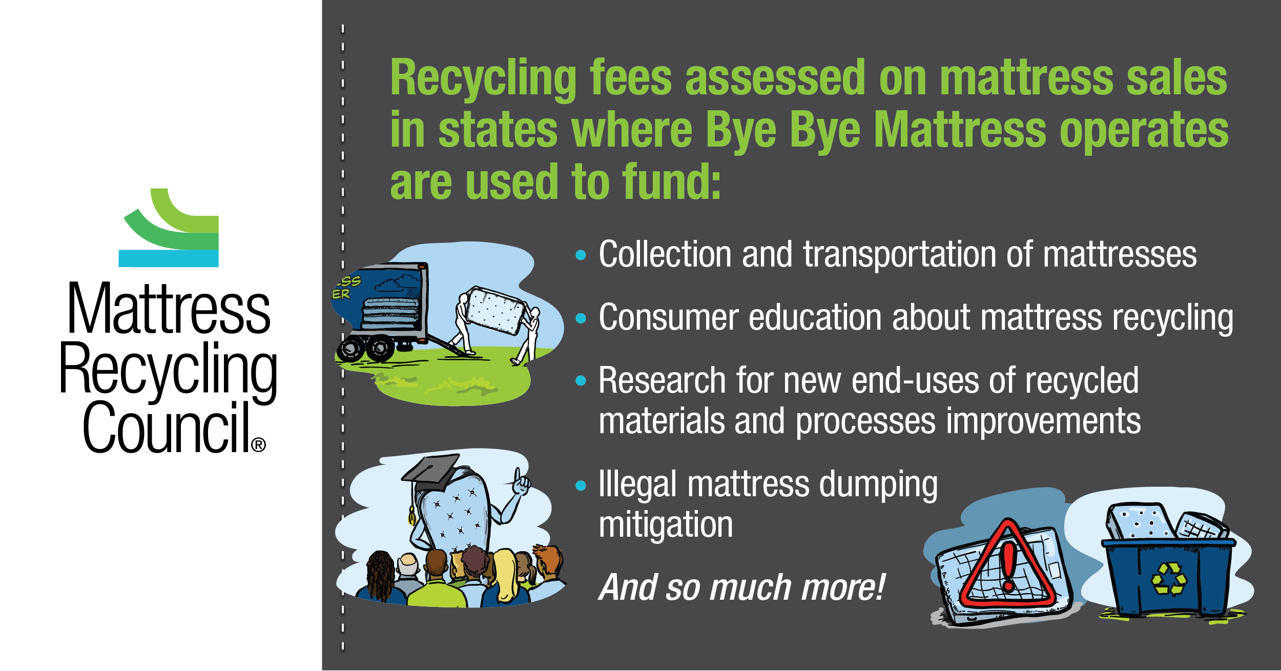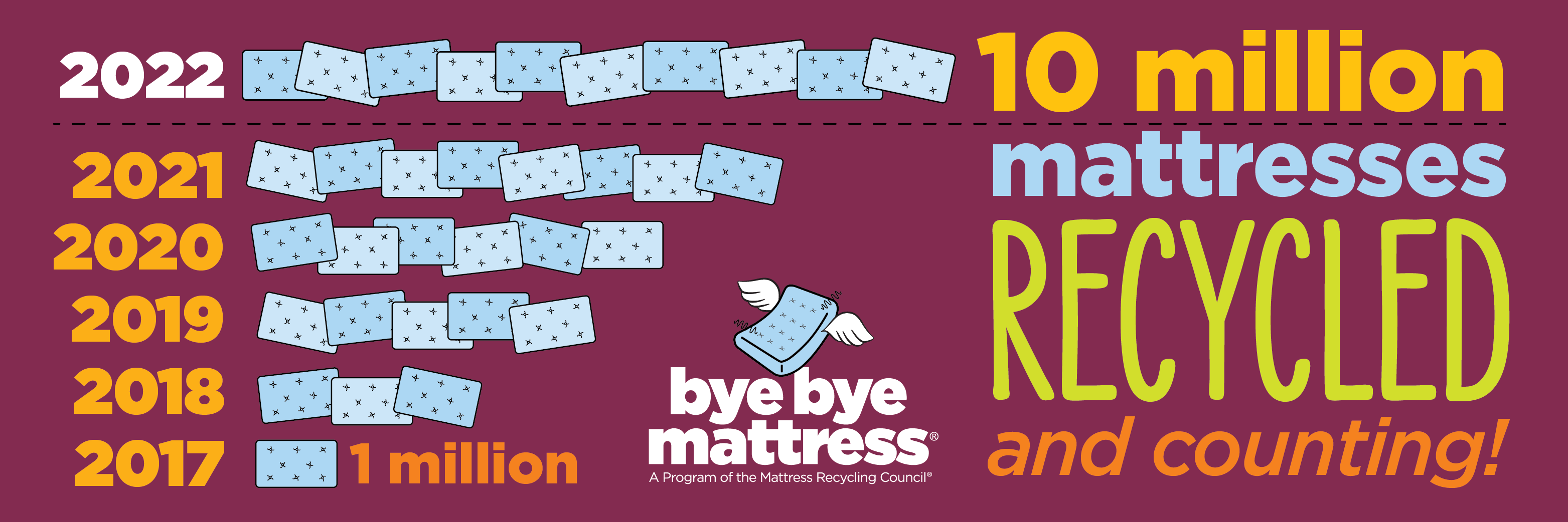 That’s where Bye Bye Mattress comes in. Developed as MRC’s consumer-facing brand, it provides a relatable voice to help people understand how and why to recycle their mattresses. Bye Bye Mattress engages the public through education, advertising, and community outreach—always backed by the mission and credibility of MRC.