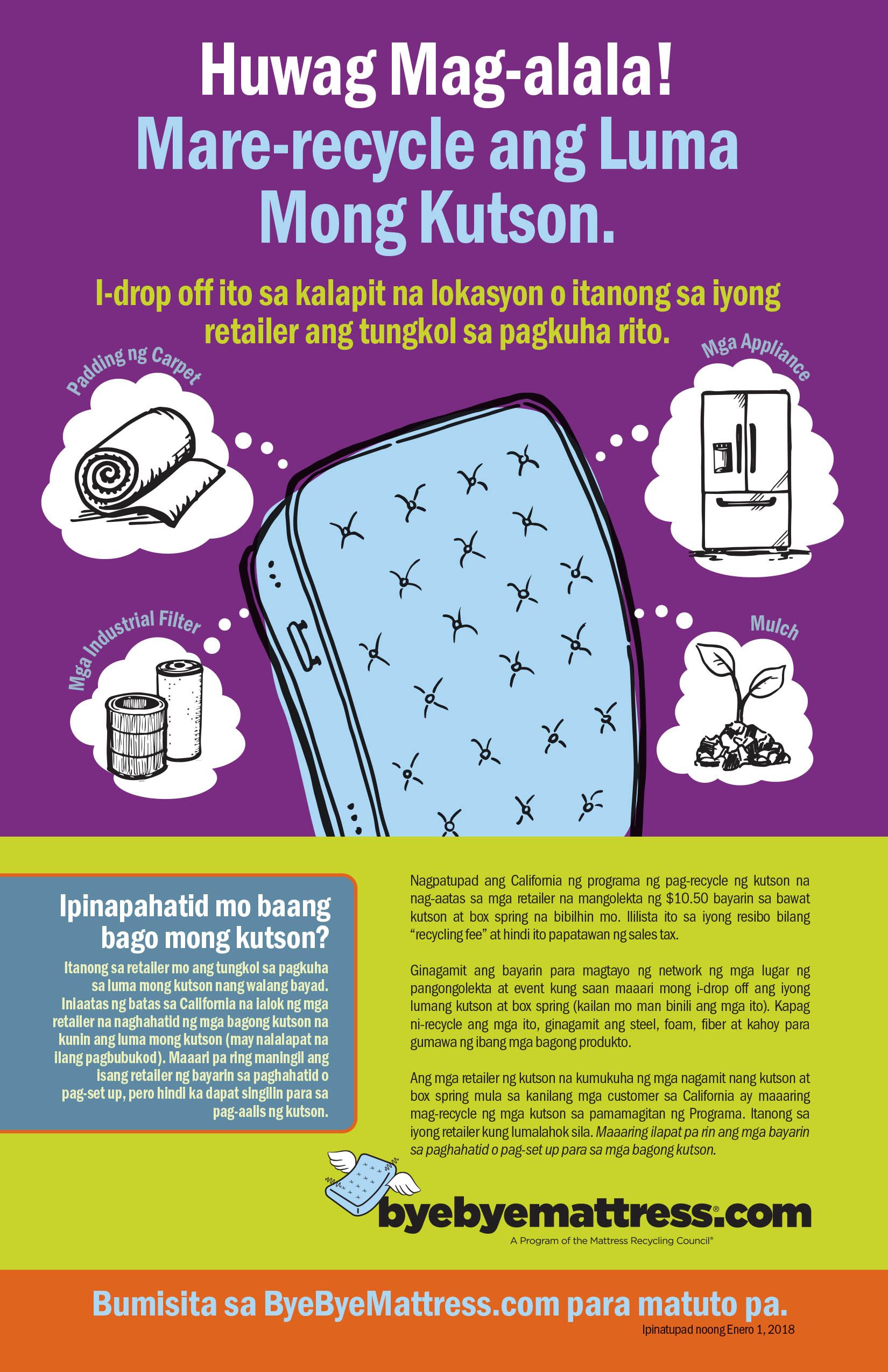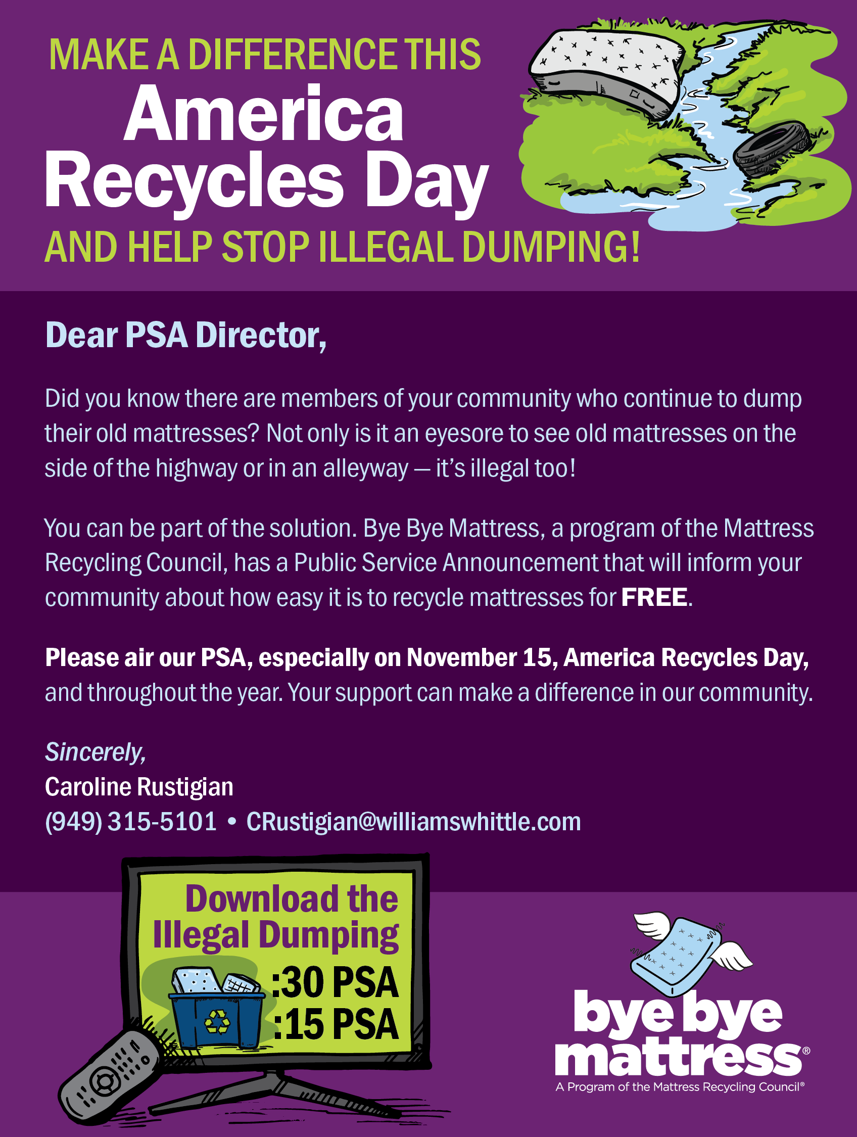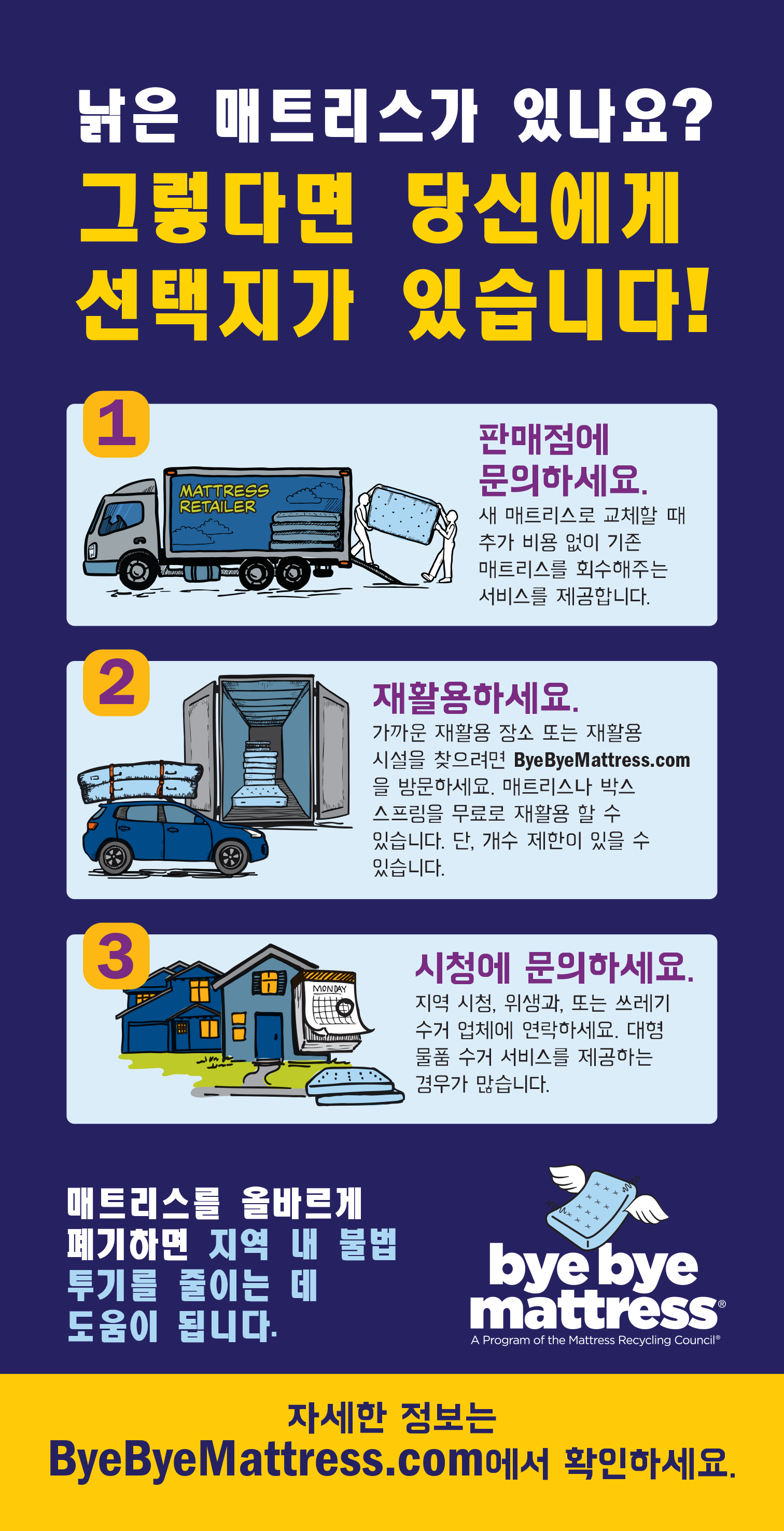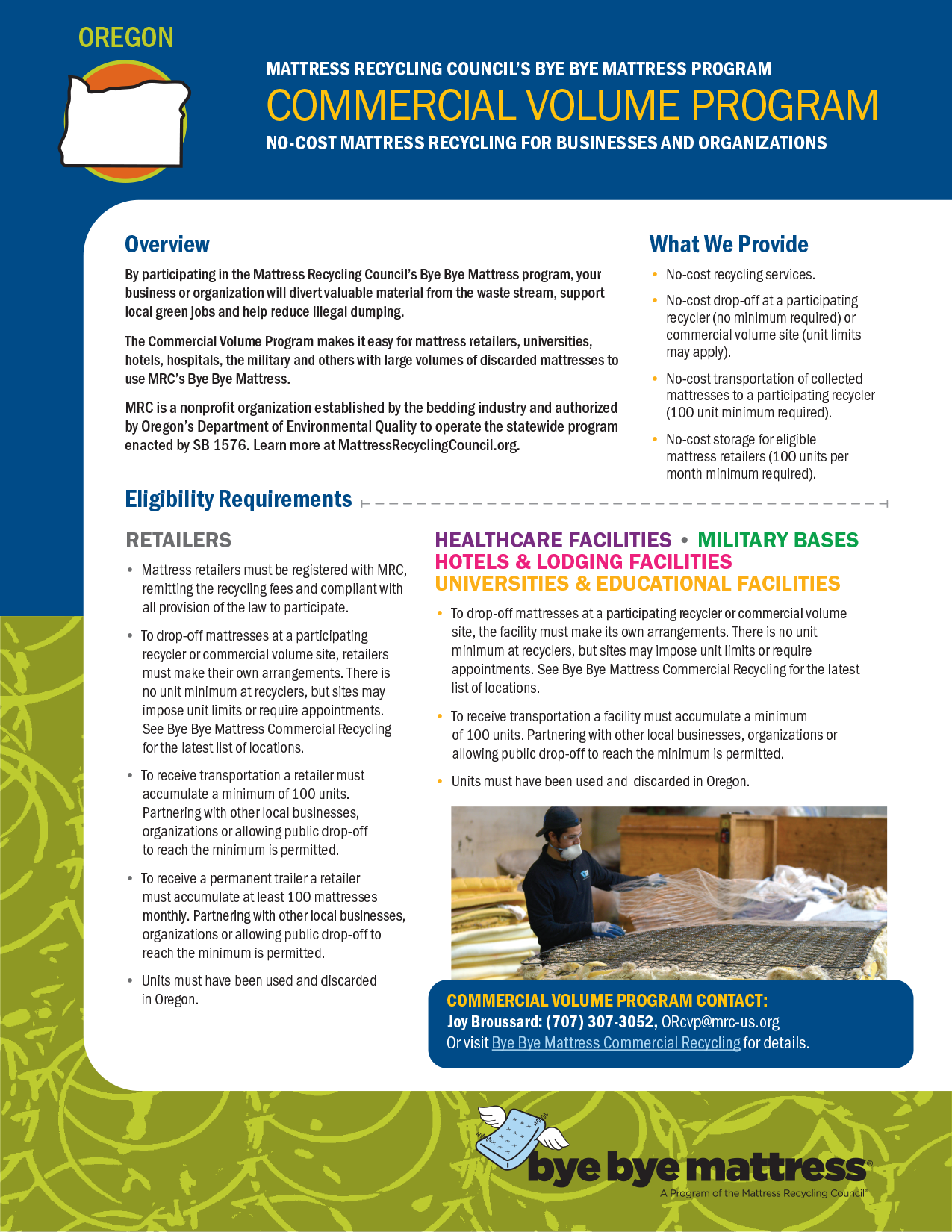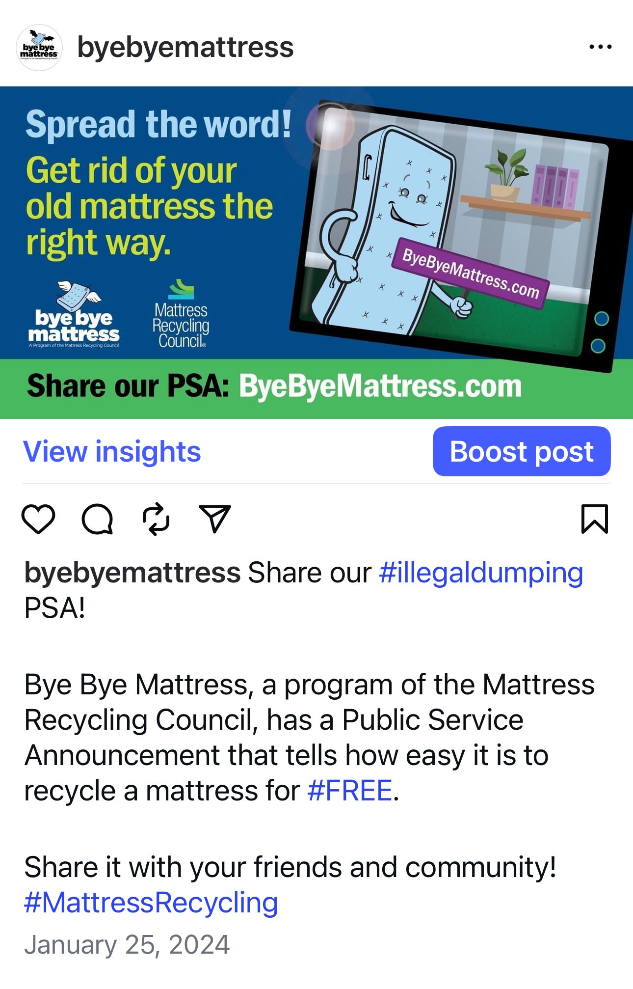 That’s where Bye Bye Mattress comes in. Developed as MRC’s consumer-facing brand, it provides a relatable voice to help people understand how and why to recycle their mattresses. Bye Bye Mattress engages the public through education, advertising, and community outreach—always backed by the mission and credibility of MRC.