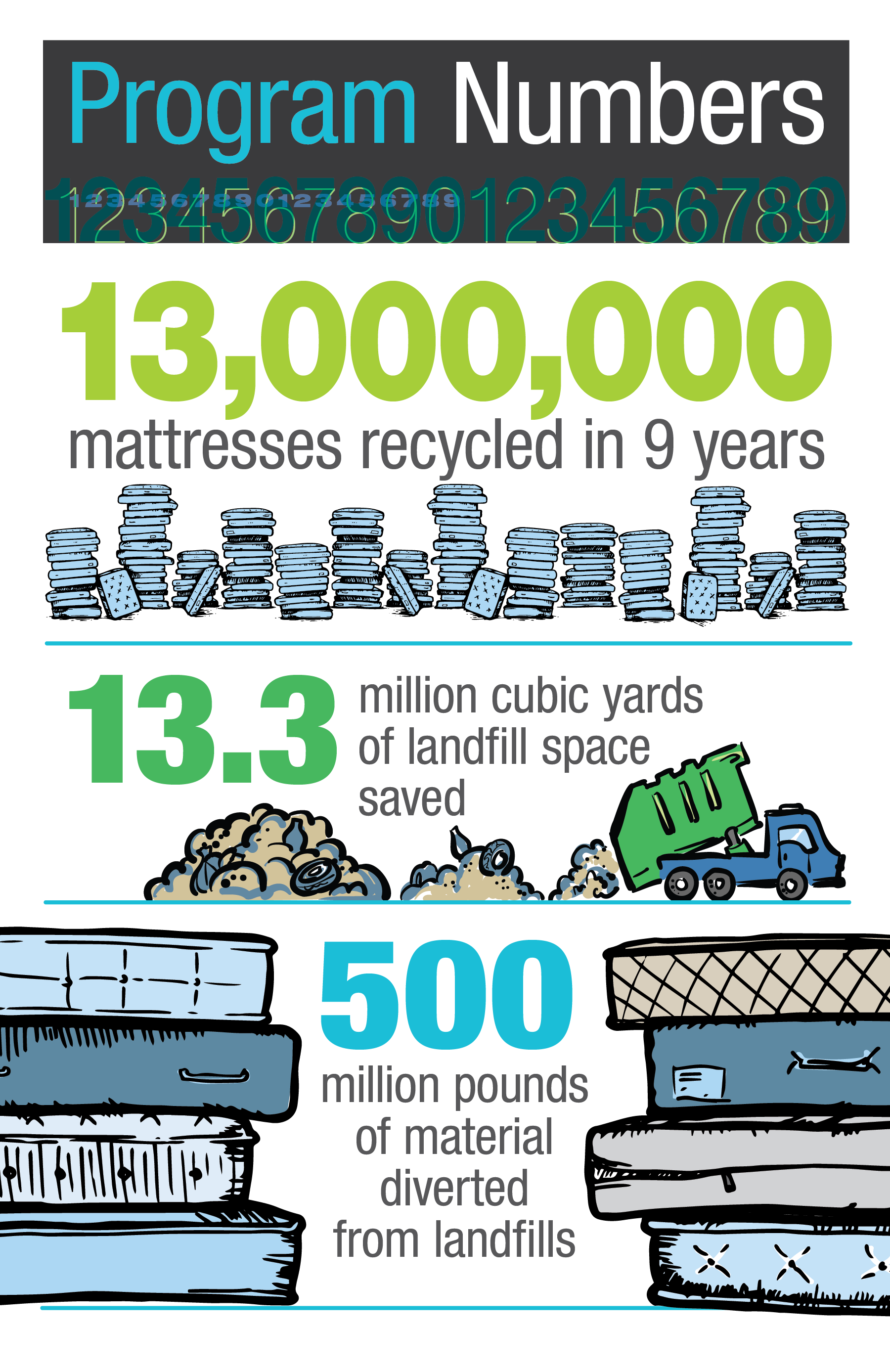 Over the past decade, our state programs have accomplished key milestones. By successfully recycling over 575 million pounds of mattress components, they have repurposed valuable materials while conserving landfill space. Discover their individual impact.