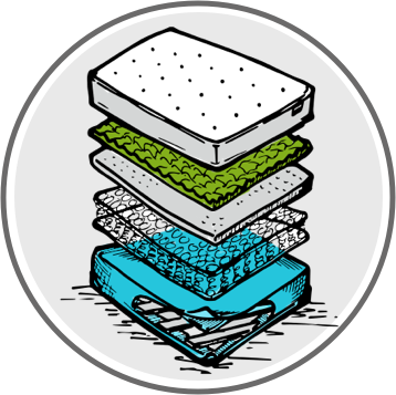 - Composition: A common barrier layer separating coils from foam comfort layers. Constructed of mixed post-industrial fabrics that have been shredded and bonded forming a dense felt like layer.